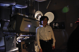 大ホール映写室に常設された35mm映写機と、映写技師・飯山氏 |